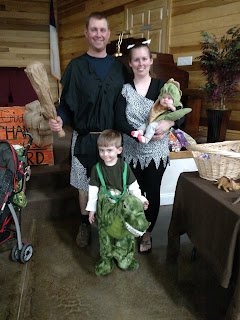 Can you tell what we were? Cavemen and two dinosaurs! Since I have no idea how to make a homemade dino costume, I bought the kid's, but I made our cavemen outfits. How you ask? Oh, I splurged. Went all out. Bought a full size black bed sheet and two leopard print pillow cases. I cut a hole in the middle of the sheet, stuck it over Lance's head, and went to trimming. Lots of points. Cavemen love pointy stuff. I cut down the seams of one pillow case and wrapped it around Lance's waist and pinned it like a skirt. Then I tied it all up with some rope. I cut a diagonal across the closed end of the other pillow case, leaving a spot un-cut to hang on my shoulder. Then I cut a hole for my right arm. I cut jaggedy points at the bottom, cause you know, cavemen love pointy stuff. And don't forget our awesome accessories. Lance has a club. Reed has a small soft bat, and I covered it in crinkled paper bags. I have a bone in my hair, like every good cave woman should wear. I printed off an outline of a bone, cut it out, and glued it onto a small ruler to it would stick out straight. Tada! Instant cave family.